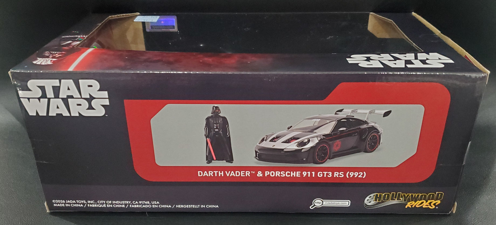 Bring the dark side to life with this premium Jada collectible featuring Darth Vader commanding a Porsche 911 GT3 RS (992). This expertly crafted die-cast model combines Star Wars iconography with high-performance automotive design, making it an essential addition for fans of both franchises. Detailed sculpting and authentic paint work capture the menace of the Sith Lord alongside the sleek engineering of Porsche's legendary sports car. Perfect for display or collection expansion. **Soft edges/corners**