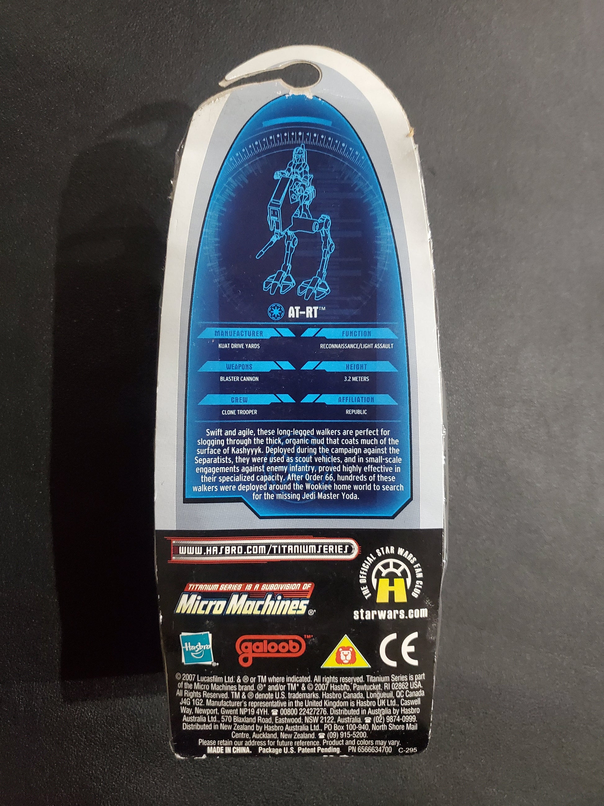 The AT-RT walker from the 2007 Star Wars Titanium Series brings the Clone Wars to life in premium die-cast form. This highly detailed collectible captures the iconic All Terrain Recon Transport with exceptional craftsmanship and authentic paint applications. Perfect for Star Wars enthusiasts and collectors, the Titanium Series is known for its superior quality and intricate sculpting. Display this impressive piece alongside other Titanium Series vehicles to build an impressive Star Wars collection. A must-have for fans of the prequel trilogy and Clone Wars era.**Packaging does show signs of wear, soft/creased corners, rubbing on blister**
