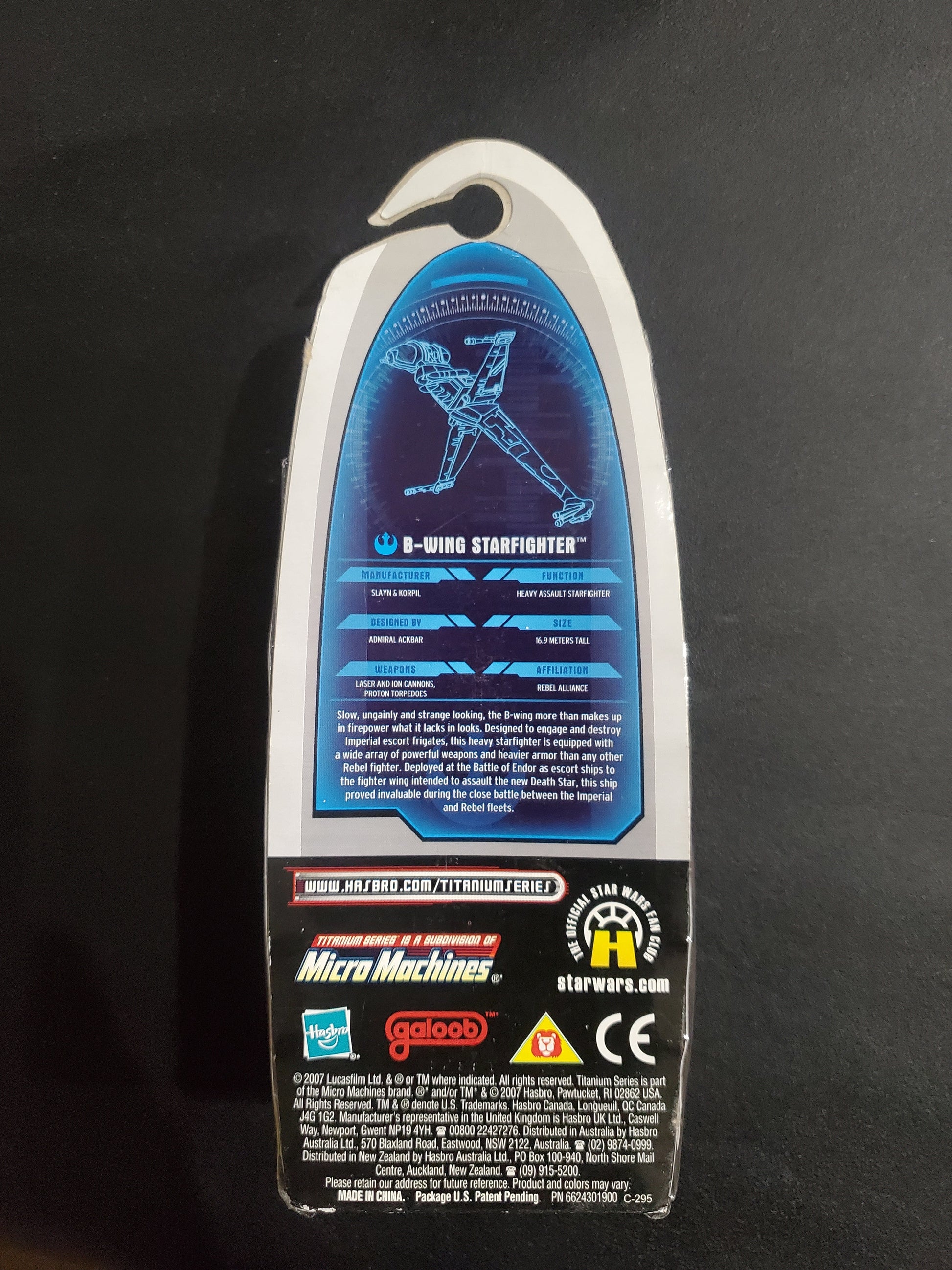 Bring home this iconic Star Wars starfighter from the legendary 2007 Titanium Series collection. This premium die-cast B-Wing Starfighter features exceptional detail and durability, making it a must-have for collectors and fans alike. The metallic finish captures the ship's sleek design perfectly, while the compact size makes it ideal for display alongside other collectibles. A timeless addition to any Star Wars collection. **Packaging does show signs of wear, soft/creased corners, rubbing on blister**