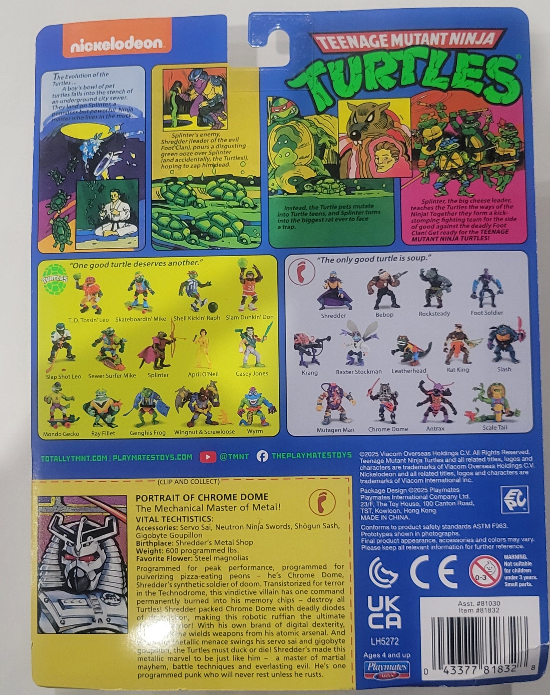 Introducing the TMNT Chrome Dome—a striking collectible that captures the iconic villain with meticulous detail. This figure showcases Chrome Dome's distinctive metallic design and imposing presence, making it an essential addition for serious Teenage Mutant Ninja Turtles enthusiasts. Expertly crafted with premium materials and authentic character representation, this collectible delivers museum-quality appeal. Perfect for display alongside your TMNT collection or as a standout centerpiece for any fan's shelf. **Package does have soft corners**